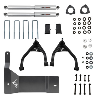 We include a combination of upper front strut spacers to lift the front end and upper control arms to improve camber, caster and maximise articulation. We also include a 1/4‑inch thick laser‑cut skid plate to protect the driveline and steering components when tackling off‑road terrain. For the rear, lift blocks and longer heavy‑duty U‑bolts level the truck's stance. We top it off with our patented rear Trail Performance twin‑tube custom‑tuned shocks.