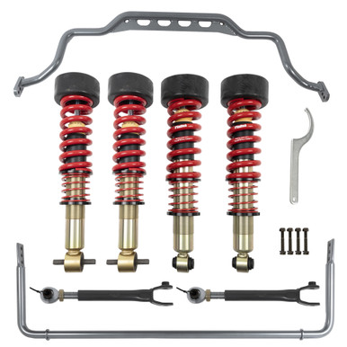 The front and rear suspension includes robust Belltech lowering coilovers designed using high-quality, multi-functional components that are built to last. Each coilover includes a finely tuned Belltech damper that features a large, 2.4" (60mm) damper body and 35mm independent rebound and compression valves to keep oil cool and deliver precise, consistent damping throughout travel. The external threads and spring perch offer customisable height adjustability. We feature a large main spring and smaller helper spring. Both springs are made of cold-formed tensile steel and are powder-coated to prevent rust and wear. The coilover uses a progressive-rate polymer, open-cell bump stop for ideal engagement, and the OE top mounts for simplified installation.