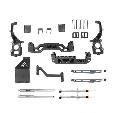 Belltech's precisely engineered lift kits include our patented front height adjustable Trail Performance struts and rear Trail Performance Twin Tube shocks. The front struts allow you to customise your vehicle's height in ½" increments so you can dial in the perfect ride height for you. The struts and rear shocks have been completely redesigned for the new F-150 chassis to enhance ride quality and handling performance of your truck. Beginning with our new multi-sleeve, vulcanised rubber bushings, we increased the durometer of the rubber and pressed in three metal sleeves with rubber in between each sleeve, which increases rigidity to help control the axles and improves your ride quality. Our Belltech lift kits also include compression arms to increase chassis rigidity and boost ride quality and handling. Our engineers were able to increase the damper forces because the new F-150 frame design is capable of handling more low and high-speed compression. The rebound damping curve was modified to match the new-gen spring and the increase in spring rate.