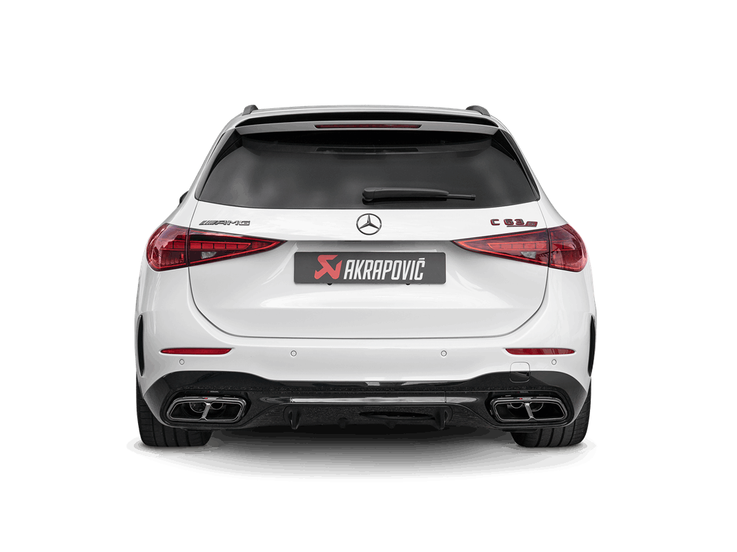 The exhaust is finished with a pair of twin tailpipes constructed from hand-crafted carbon-fibre outer sleeves and high-grade titanium inner sleeves, and the use of lightweight race-proven materials has reduced the weight by 26.5 % (3.6 kg) over the standard stock system. Performance has been enhanced with a power increase of 6.3 kW (8.6 hp) at 6,650 rpm and a torque gain of 13.5 Nm at 2,650 rpm when tested on the Akrapovic dyno against a Mercedes-AMG C 43 4MATIC with a standard stock exhaust. This product is ECE type approved. The plug-and-play installation means no remapping is required. An optional Akrapovic Sound Kit is also available, as well as an optional Evolution Link Pipe Set (SS) for owners looking for an enhanced acoustic experience and greater performance from the Akrapovic Slip-On Line (Titanium) exhaust.