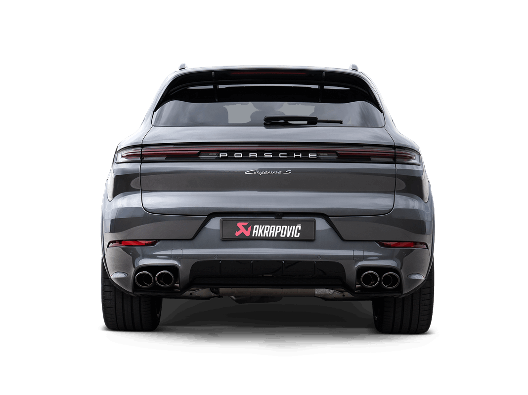 This product is constructed from high-grade lightweight titanium featuring a central muffler with two pairs of striking double round handmade carbon-fibre tailpipes, which contain acoustic reflectors, designed to enhance the sound experience for both the driver and passengers. The valves on both sides of the muffler control gas flow, with housings cast in-house. The weight is 44.8% (14.6 kg) lower than the sport stock exhaust. A power gain of 4.2 kW (5.7 hp) at 5,950 rpm and torque increase of 8.0 Nm at 2,150 rpm were achieved when tested on the Akrapovic dyno against a Porsche Cayenne S E-Hybrid Coupe with a stock sport exhaust system.