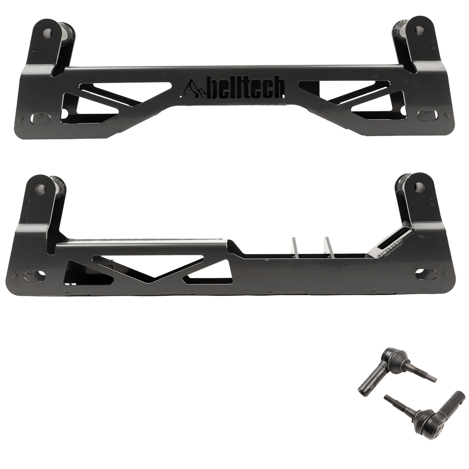 The front end of our kit includes 2.4 inch (60 mm) large-bodied, finely tuned, height-adjustable Trail Performance coilovers, which house increased amounts of oil and employ a low-friction design to give you perfect damping throughout your journey. Our coilover damper bodies are threaded so you can position the spring perch wherever you desire, resulting in a ride height from 6 to 9 inches of lift. The GM lift kit's unique design uses a 1/4 inch thick steel skid plate to shield the front differential. Belltech heavy-duty lift spindles are used in place of your OE spindles to retain factory suspension geometry. Also used to maintain proper suspension angles is our differential drop kit. Belltech crossmembers are made to be extremely durable, constructed of 1/4 inch steel and powder coated to prevent rust and wear. In the front end, we also use Belltech spindles to accommodate the major lift. They are extremely robust, comprised of ductile iron and powder coated grey. To reduce body-roll and improve vehicle steadiness, we add a 1 3/8 inch cold-formed solid steel sway bar that is uniquely intended to perform on your lifted vehicle.