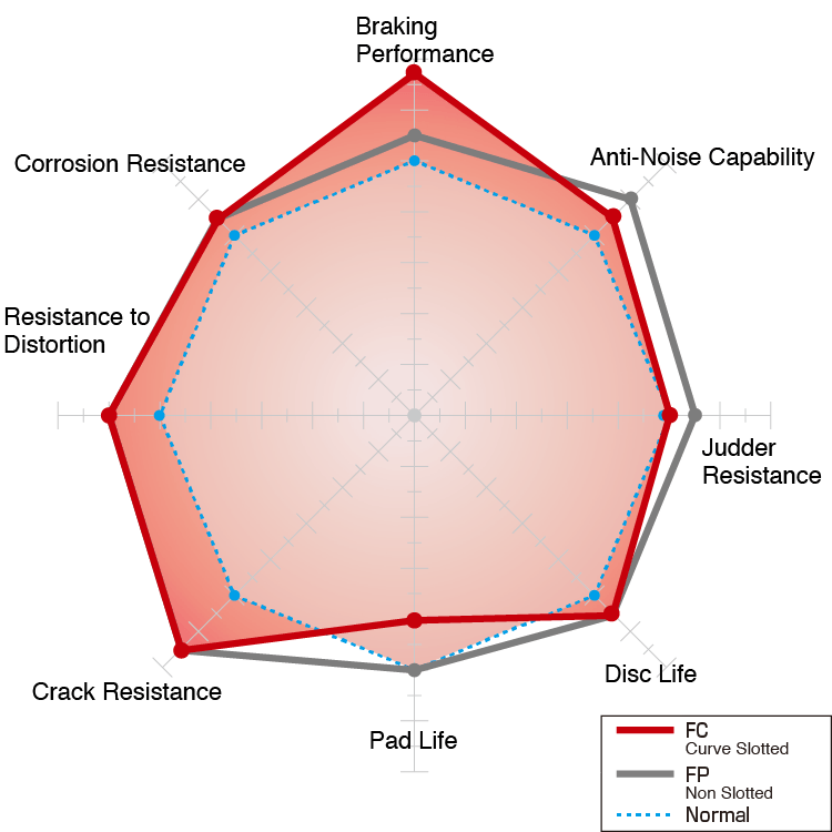 • Newly designed 8 curved slots enable high friction μ:from cold application and stability under high brake load.