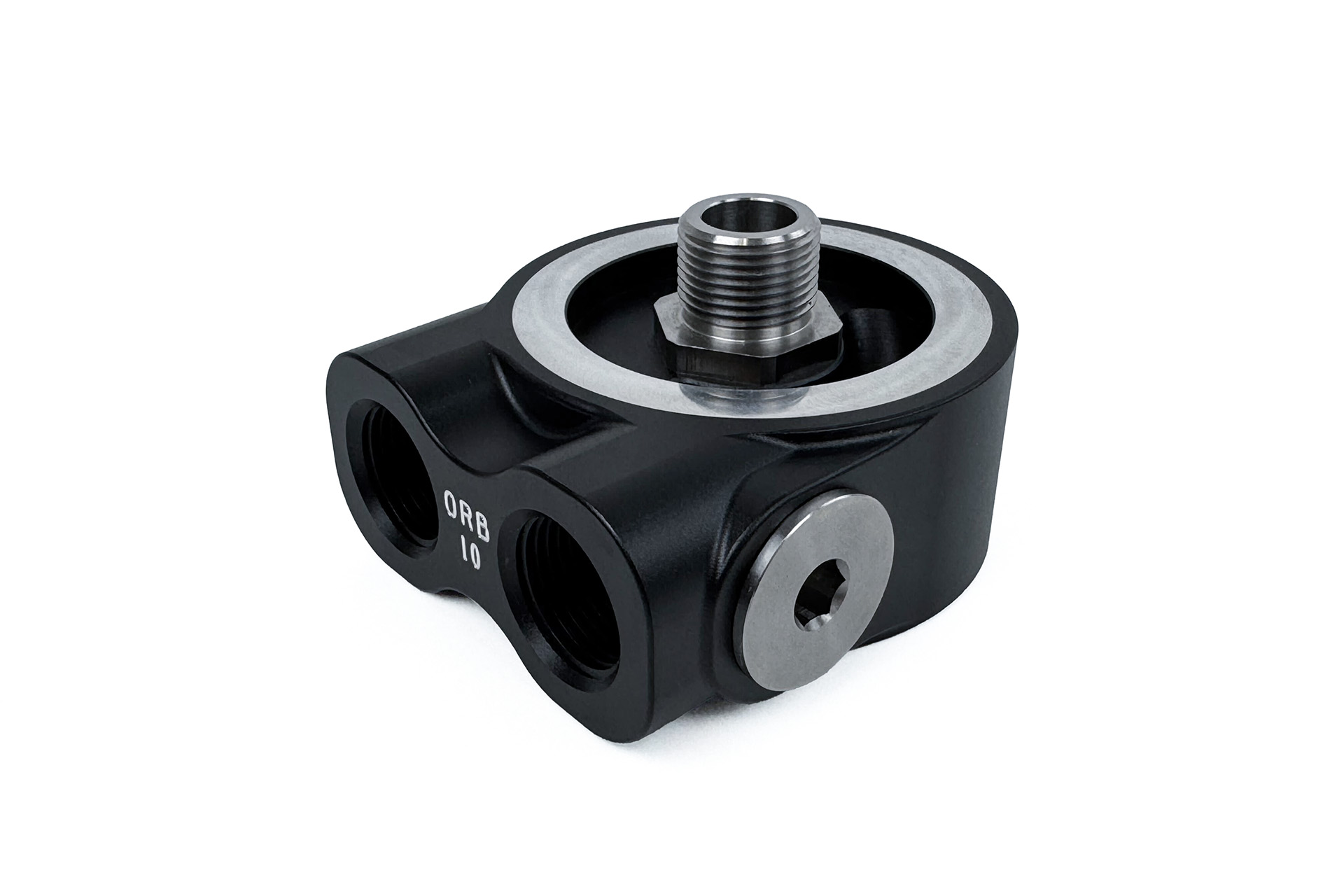 Oil flow is managed by a Billet Aluminum thermostatic sandwich plate. This plate bolts in the factory oil filter location with a M20x1.5 adapter. The sandwich plate was designed to reuse the OE oil filter but can be fitted with a larger filter up to 70mm in diameter with a M20x1.5 thread (check height clearance when looking at filter options).