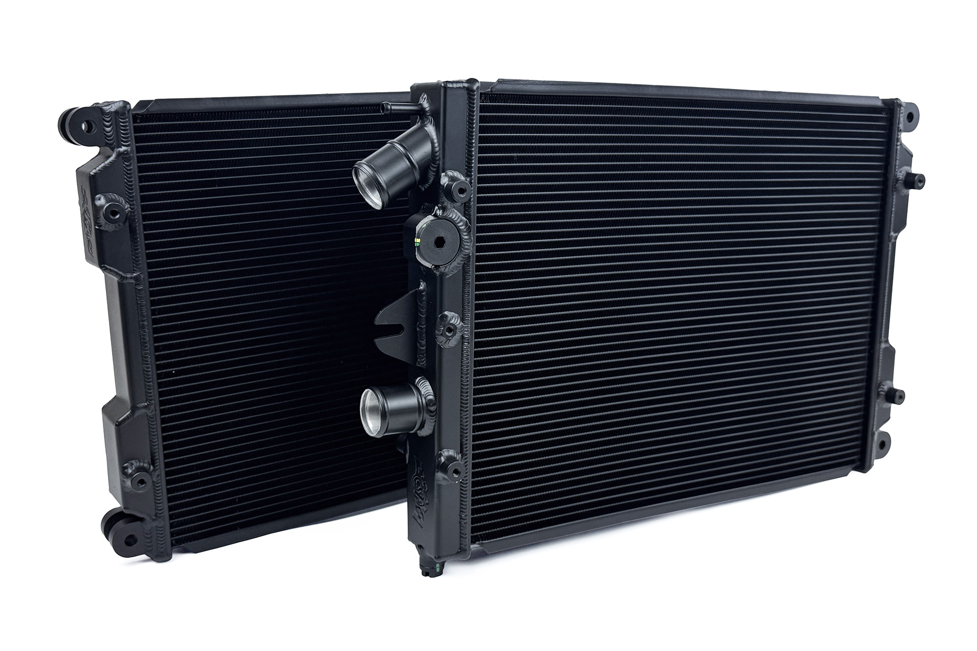 The CSF radiators feature the latest 5mm multi-louvered fins. These fins significantly increase the heat exchange surface area improving overall cooling efficiency and recovery while still maintaining good airflow. The core is much larger than the factory featuring 2-Row 42mm aluminum core. This both increases the fluid capacity of the radiator, and improves the cores ability to dissipate heat. The use of CSF's 5mm fins also allowed for 12 additional cooling tubes and fin rows.
