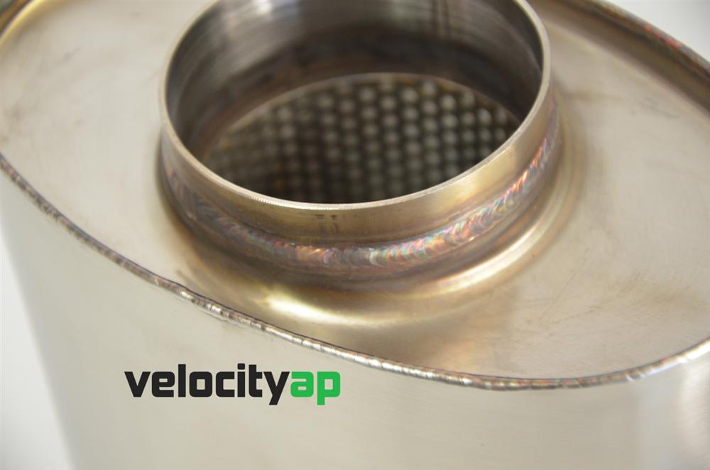VelocityAP 304 Grade Stainless Steel Universal Muffler. 3" Single Intlet/Outlet. Touring Sound Level - 9" Perf. 7.5" Wide x 4.5 Tall