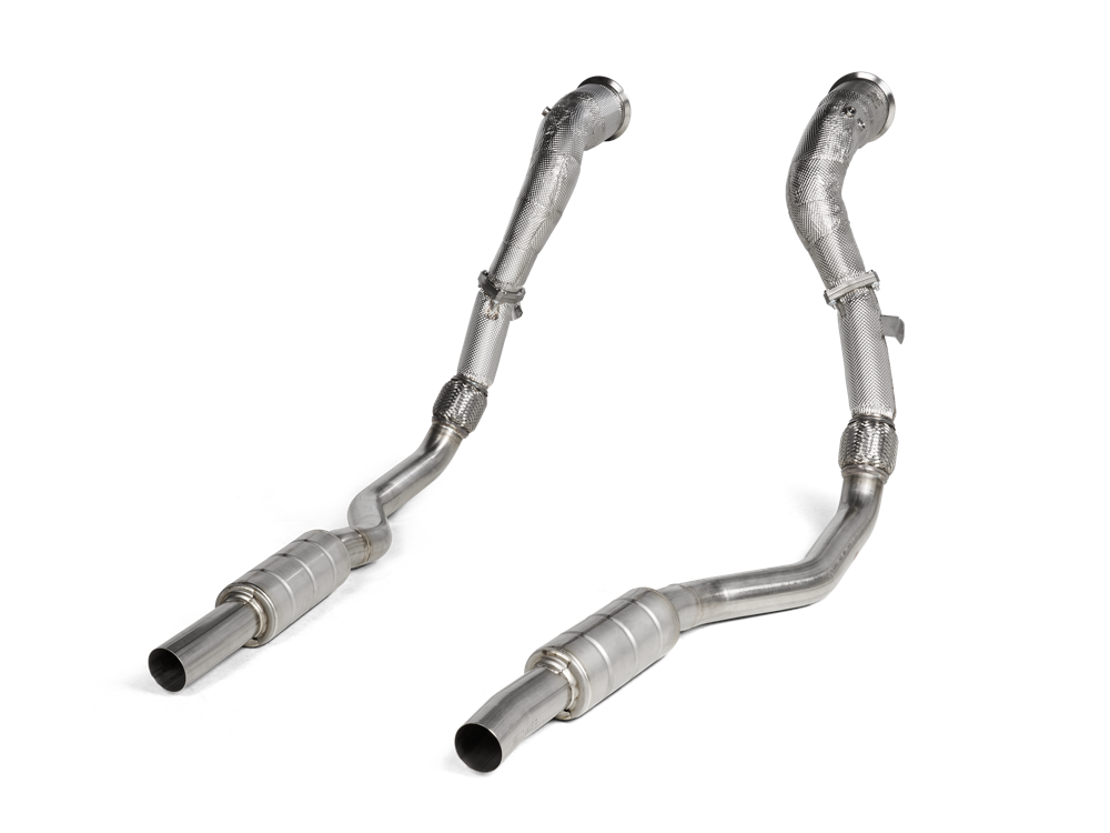 When combined with the Evolution Line (Titanium) exhaust system the addition of the optional stainless steel Downpipe / Link pipe set (SS) will deliver a unique sound experience: from a low-down rumble to a strong mid-range V8 character and high frequency top end with the recognisable Akrapovic racing sound. The stainless steel downpipes, with sporty 200 cpsi catalytic converters, are insulated to prevent overheating the surrounding parts, and the stainless steel link pipes that have been developed to fit on Akrapovic downpipes feature custom made flex tubes and full insulation where they connect to the downpipes.