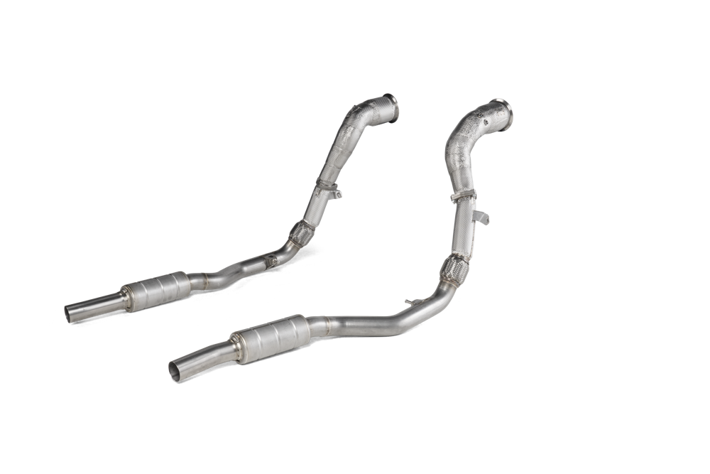 This is an optional part as an upgrade to the Evolution Line (Titanium) exhaust for further tuning. The downpipes are high-quality stainless steel, containing sporty 200 cpsi catalytic converters, insulated to prevent overheating any parts around them. The stainless-steel link pipes have custom-made flex tubes, with insulation where they connect to the downpipes. When fitted with the Evolution Line (Titanium), the entire configuration offers a unique acoustic experience. It is perfectly tuned by the sound engineers to produce pure V8 aural performance because the two areas of the exhaust work in harmony to create a high-frequency racing tone in the upper rev range and a deep and torquey V8 rumble in lower revs, with the comfort mode retained for those more sedate moments.