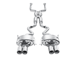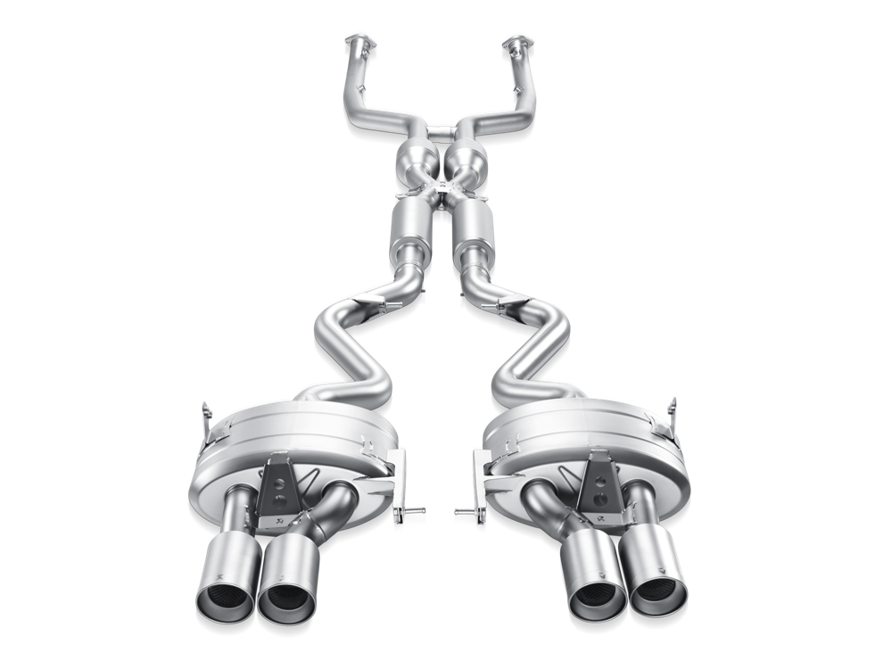 The Evolution performance exhaust system for the BMW M3 consists of dual-outlet mufflers, flow-optimized link pipes, and an X-pipe that incorporates high-flow 100 cpsi sports catalytic convertors and resonators. The power and torque gains of the BMW M3 with the Evolution system are just amazing. A substantial increase is detected over a very wide rpm range, and so it increases responsiveness during all phases of driving. Together with incredible weight savings, the Evolution system dramatically changes the power-to-weight ratio. Our goal was to design a system that delivers a deep, rich growl at cruising speeds while also allowing the driver to enjoy an aggressive roar when driving hard. Complete the look with a set of two exquisite tailpipes in titanium or carbon fibre.