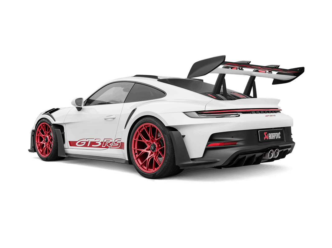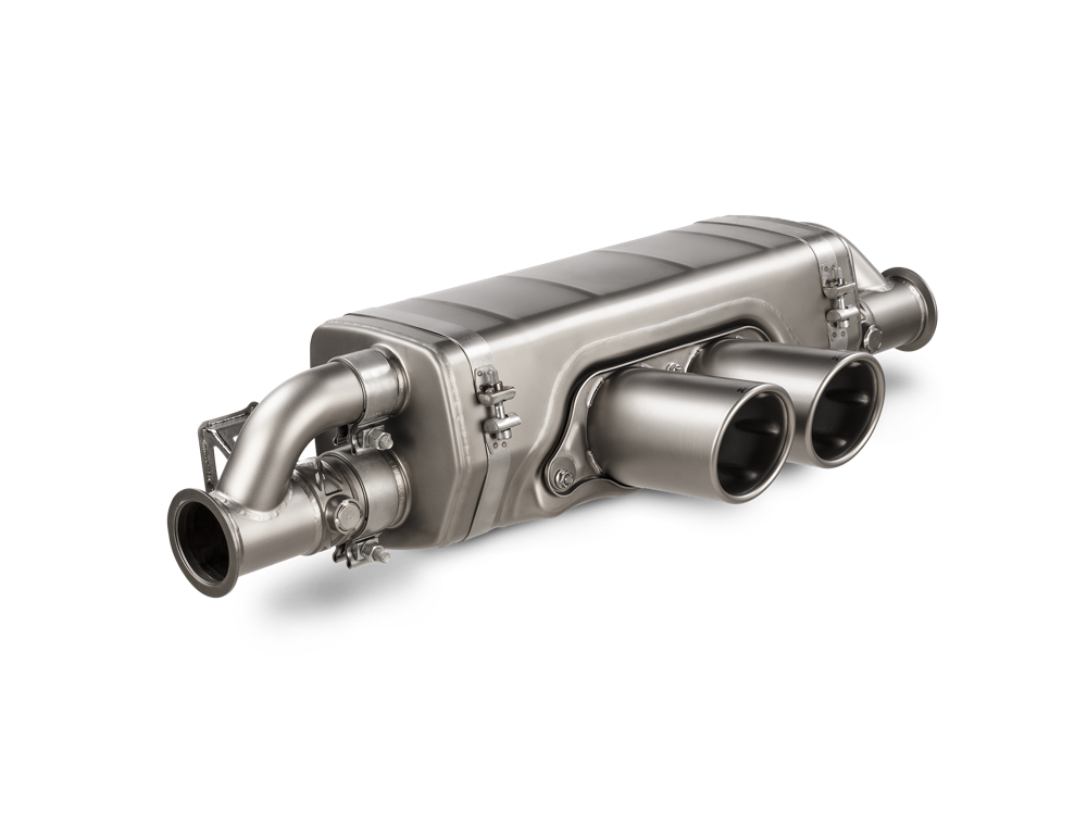 Tuned quarter-length resonators in addition to the catalytic converters ensure the sound quality and the absence of any distortion or unwanted frequencies, creating a unique sound experience. The combination of an Akrapovic Slip-On Race Line (Titanium) and Evolution Header Set (Titanium), developed for use on closed-course competition circuits only, provides increases of 16.6 kW (22.6 hp) in power at 4,550 rpm and 35.2 Nm in torque at 4,500 rpm, when tested on the Akrapovic dyno against a Porsche 911 GT3 (992) with a standard stock exhaust.