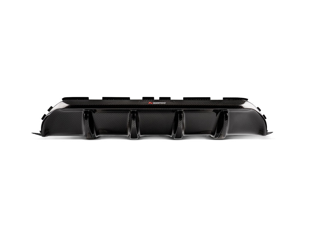 This Rear Carbon Fiber Diffuser - High Glossy, comes with red/white Akrapovic logo.