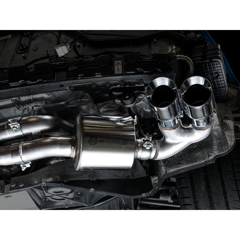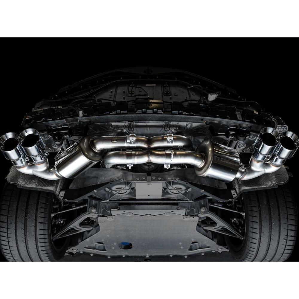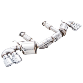 Presenting the Best Sounding Exhausts on the Planet for the C8 Corvette: At the intersection of sophistication and aggression lies the Touring Edition Exhaust. A dual 3” T304L stainless steel cat-back configuration, the AWE Touring Edition Exhaust is the perfect dose of steel for drivers looking for straight-pipe performance without sacrificing perfect daily drivability: a deep, sophisticated, exotic exhaust note with zero drone at highway speeds -- and V4 mode! Thanks to the asymmetric design, the number of necessary bends is minimized, thus removing the unwanted restriction in flow while facilitating impressive gains across the entire powerband. Paired with robust internally lined stainless steel flex sections upstream, engine movement is significantly isolated, enabling life-long durability for peace of mind. Going the asymmetric approach also allowed us the opportunity of creating a bespoke cross-over section with entries from both the top and the bottom. Doing this we're able to achieve a rich and aggressive exhaust note out of the LT2 whether it be at idle, rev, or WOT. Beyond the unique crossover, the Touring Edition brings up the rear in proper fashion by featuring AWE’s patented drone-canceling solution, 180 Technology®, which targets and omits drone-prone frequencies while defeating the dreaded in-cabin tone change when switching between V4 and V8 modes. What’s this mean for you? You’ll be tuned into a pure, full-bodied LT2 soundtrack unlike any other without sacrificing in-cabin refinement, all while saving 31 lbs over stock. As a finishing touch, the included aluminum heat shield bolts to the bumper (via factory mounting locations) and resides neatly behind the exhaust, out of sight, with only an AWE logo showing through the rear mesh to let everyone know what team you're on. Why’d we go with an aluminum solution versus a heat blanket? Heat blankets are susceptible to waterlogging and material breakdown over extended periods of time.