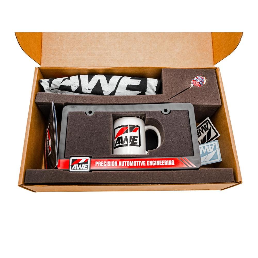 This box has everything you need to rep your favorite aftermarket brand (that's AWE, btw). Here's the scoop: This box comes complete with the AWE License Plate Frame, the AWE Distressed Logo Tee in your size, the AWE Performance Coffee Mug, AWE Small Window Decals, and maybe some special stuff if we're in the mood. It's a great starter pack to go with your AWE parts, because who doesn't want to rep the Best Sounding Exhausts on the Planet?