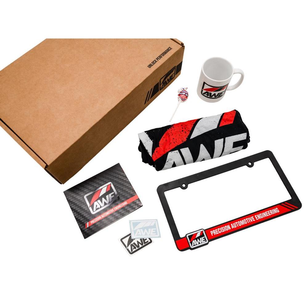 This box has everything you need to rep your favorite aftermarket brand (that's AWE, btw). Here's the scoop: This box comes complete with the AWE License Plate Frame, the AWE Distressed Logo Tee in your size, the AWE Performance Coffee Mug, AWE Small Window Decals, and maybe some special stuff if we're in the mood. It's a great starter pack to go with your AWE parts, because who doesn't want to rep the Best Sounding Exhausts on the Planet?