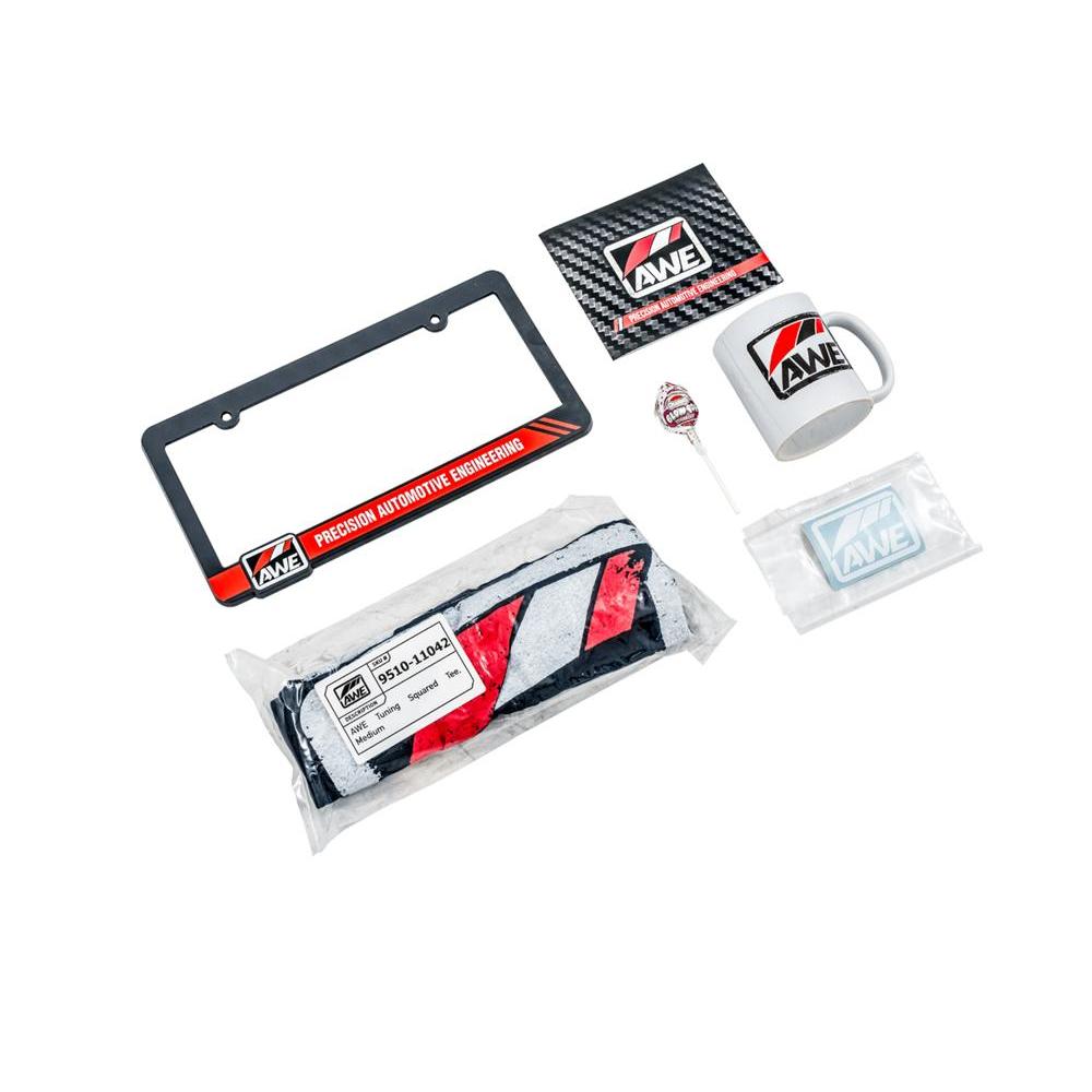 This box has everything you need to rep your favorite aftermarket brand (that's AWE, btw). Here's the scoop: This box comes complete with the AWE License Plate Frame, the AWE Distressed Logo Tee in your size, the AWE Performance Coffee Mug, AWE Small Window Decals, and maybe some special stuff if we're in the mood. It's a great starter pack to go with your AWE parts, because who doesn't want to rep the Best Sounding Exhausts on the Planet?