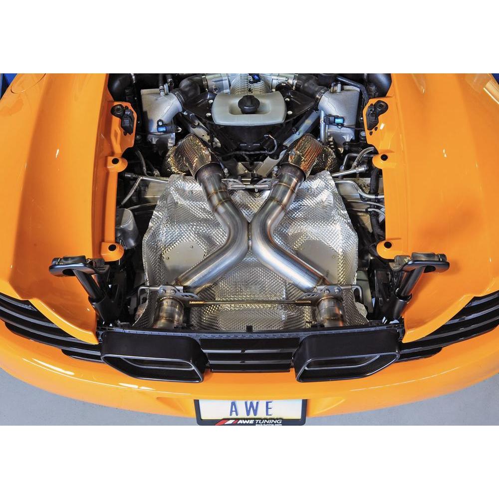 AWE has merged decades in supercar performance products with rigorous study of the peerless engineering behind the McLaren MP4-12C to create one of the finest exhaust systems available, for one of the finest vehicles available. The AWE Performance Exhaust for the McLaren MP4-12C is designed to perfectly smooth the aggressively raw tone that results from mating the AWE Performance Catalysts to the stock exhaust system. The resulting acoustic character is nothing short of breathtaking, offering a note that is both hard-hitting and exotic.The exhaust is constructed from mandrel bent 304 stainless steel at 3” diameter throughout and features a small balance opening between the banks which produces the exotic, high pitched wail. The AWE Performance Exhaust features logo tips evoking the factory geometry in a discrete satin black finish.