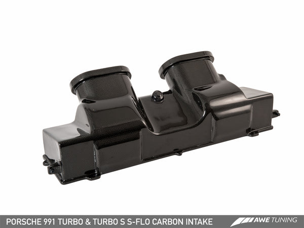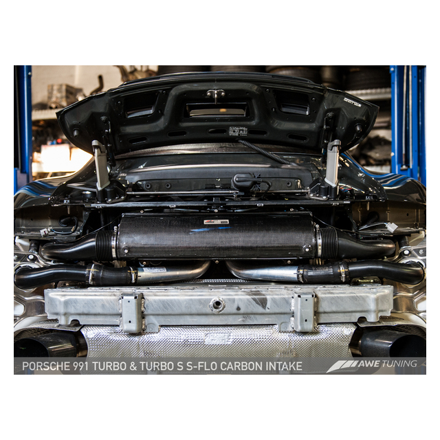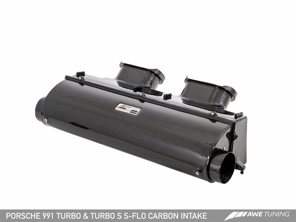 Stunning looks. Breathtaking performance. The AWE Porsche 991.1 / 991.2 Turbo and Turbo S S-FLO Carbon Intake: The carbon fiber airbox: Fitment is guaranteed, airbox geometry is 3D scanned and optimized, and mating to the factory air inlet pipes is perfect. The 100% carbon fiber AWE Porsche 991.1 / 991.2 Turbo and Turbo S S-FLO Carbon Intake is crafted from high grade 2x2 carbon fiber and boasts UV stabilized clear coat to prevent yellowing from under hood heat. The smooth carbon fiber tubes inside the 100% enclosed air box provide a less restrictive path to the factory inlet pipes - in other words, when combined with the S-FLO Filter, We're talking 22 hp and 22 lb-ft of torque at the crank. The AWE S-FLO Filter: The dual S-FLO Filters were specifically designed to maximize airflow in the AWE ® S-FLO Carbon Intake. The cleverly engineered S-FLO Filters increase surface area, resulting in increased airflow to deliver the coolest possible air to yAWE's engine. Intake noises are also augmented, a subtle reminder of the engineering tucked beneath the carbon shell. Please note, AWE S-FLO Intakes are for racing use only.