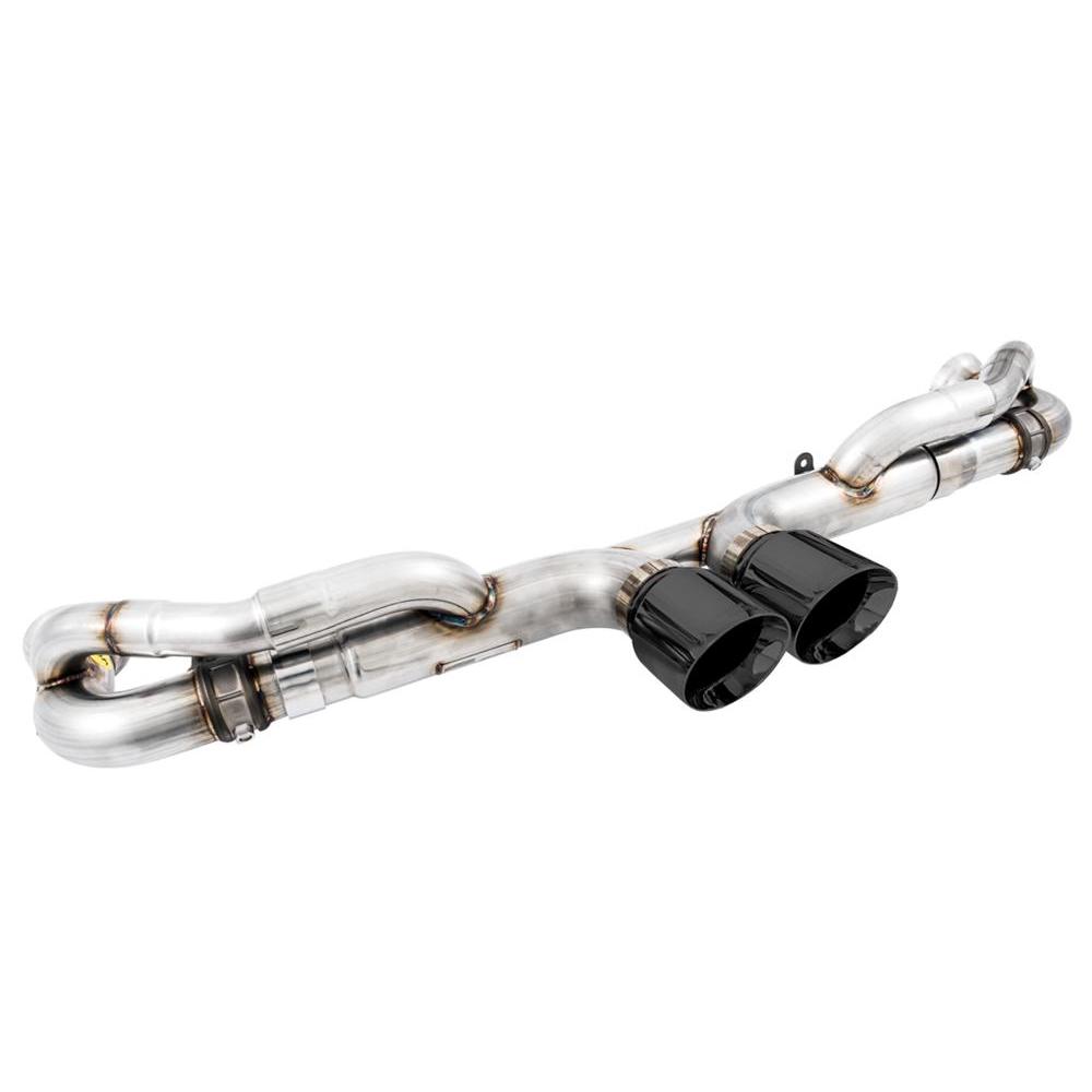 Comprised of a center muffler delete featuring a balance pipe, and valved side muffler deletes, the SwitchPath™ Exhaust retains the factory valve operation while providing a significant increase in power, weight reduction, and an eye-widening soundtrack. The SwitchPath™ Exhaust will respond to your driving style: once the ECU registers your RPM and opens the valves, the tone produced from the SwitchPath™ evolves from sophisticated street car to roaring Cup Car. Thanks to the 0.65” wall T304 stainless steel, the SwitchPath™ Exhaust provides a deep and refined exotic tone, even with the valves closed. The factory exhaust, as a whole, weighs 65 lbs (side mufflers: 22lbs each, center muffler: 18lbs, and tips: 3lbs). The AWE Center Muffler Delete, with tips, weighs only 9lbs. The SwitchPath™ Exhaust, with tips, weighs only 17lbs resulting in a weight savings of 48lbs. The 102mm slash-cut Diamond Black tips include the AWE logo, and double walling to ensure a mirror finish even under hard usage. All tips are individually adjustable, allowing depth into the bumper to be set according to personal taste.