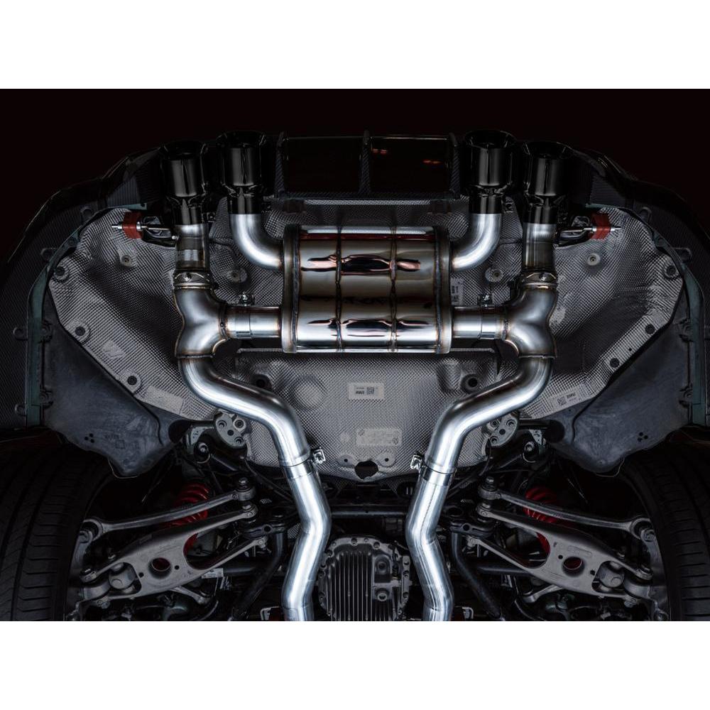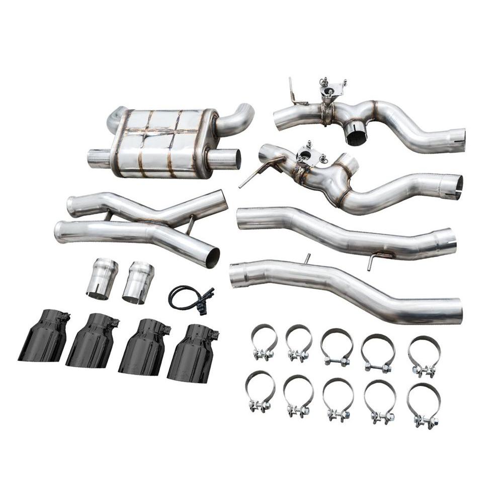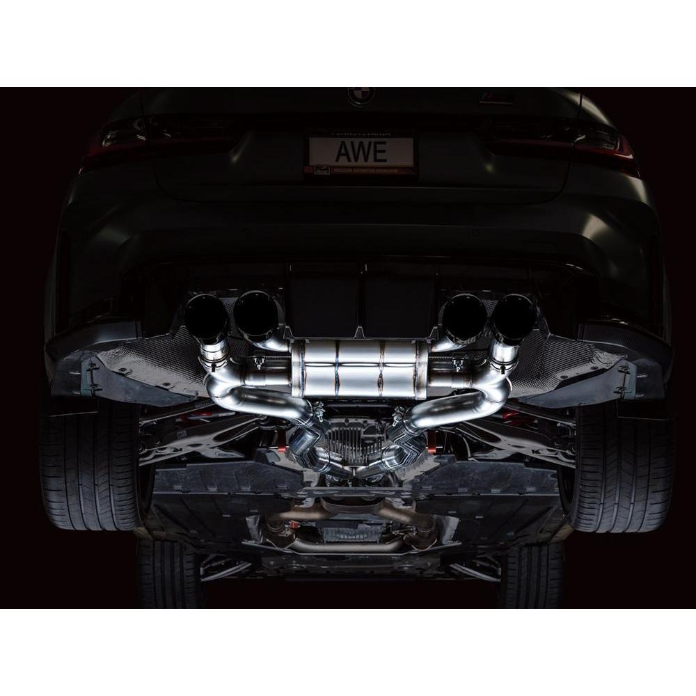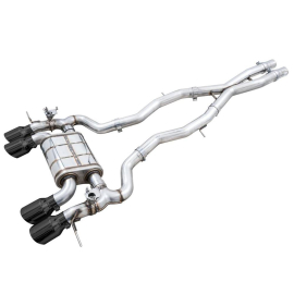 Presenting the first AWE SwitchPath™ configuration for BMW to incorporate patented drone-canceling 180 Technology®. No drone, minimal bends, maximum flow, and push-button attitude. The SwitchPath™ Exhaust is comprised of 3-inch U.S.-sourced T304L stainless steel, a precision x-pipe, and a valved SwitchPath™ muffler tuned specifically for the S58. Beginning after factory mid pipe, the precision X-pipe immediately helps smooth the S58 of its rasp, deepening the tone before its refined further by the bespoke SwitchPath™ muffler in the rear. When the valves are closed, the SwitchPath™ Exhaust produces a refined, aggressive howl while remaining full-bodied and powerful – no congested, metallic sounds when on the throttle. At cruising speeds, interior acoustics are close to stock with no drone at cruising speeds. AWE SwitchPath™ tech also responds perfectly to the many transmission settings and shift points in automatic vehicles. Drop the hammer with the valves closed and SwitchPath™ sings a proper M anthem. If you were to leave the valves closed at all times after equipping SwitchPath™, we wouldn’t blame you — it’s that good… all of the time. Open the valves and the S58’s roar is uncorked. Sport and Sport+ modes achieve the ultimate contrast in behavior when compared to comfort driving modes (valves closed). In Sport mode, the exhaust note is powerful, clean, and aggressive. In Sport+ mode, the same aggression applies… but with grin-provoking burbles. Thanks to the precision X-pipe, the rasp is still kept in check while allowing the exhaust note to reach full aggression.