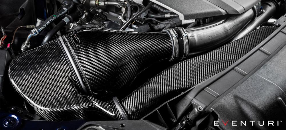The Audi B9 RS4/RS5 Eventuri intake was developed to give less restrictive airflow to the turbo whilst maintaining low inlet temperatures. The RS5/RS4 engine bay becomes heat soaked very quickly so simply having an open cone system would result in better airflow but with higher inlet temperatures. We therefore completely re-engineered the inlet track from the turbo inlet pipe to the front grill with a highly efficient sealed system. The restrictive stock airbox and flexible plastic inlet pipe have been replaced with a Venturi filter housing and a duct system with smooth transitions. Furthermore, by removing the convoluted stock inlet pipe and replacing it with our one-piece Venturi housing and solid tube, the airflow is much smoother as it enters the turbo inlet tube. The resulting performance gains and aesthetics are industry leading for this platform.