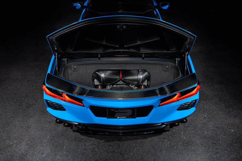 The C8 Corvette Eventuri intake sets a new benchmark on this platform for the highest performing intake and the largest internal volume available*. With the intake size and shape restricted by the OEM trunk panel, we redesigned it to allow for a larger intake. In doing so we also made it from clear Polycarbonate to allow the carbon intake to be on display when the trunk is open. Utilizing our Patented Venturi Housing concept, airflow is able to negotiate through the filters with a much less tortuous path thus reducing the drag of the system. Furthermore by increasing the overall volume in the intake, the flow capacity has also been increased allowing higher powered builds to maximize on performance gains. Intake air temperatures have been minimized by ensuring a sealed system, taking advantage of the OEM air feeds as well as using carbon fiber which has a low thermal conductivity coefficient across the wall thickness. The resulting system provides industry leading performance gains and a noticeable improvement in throttle response.
