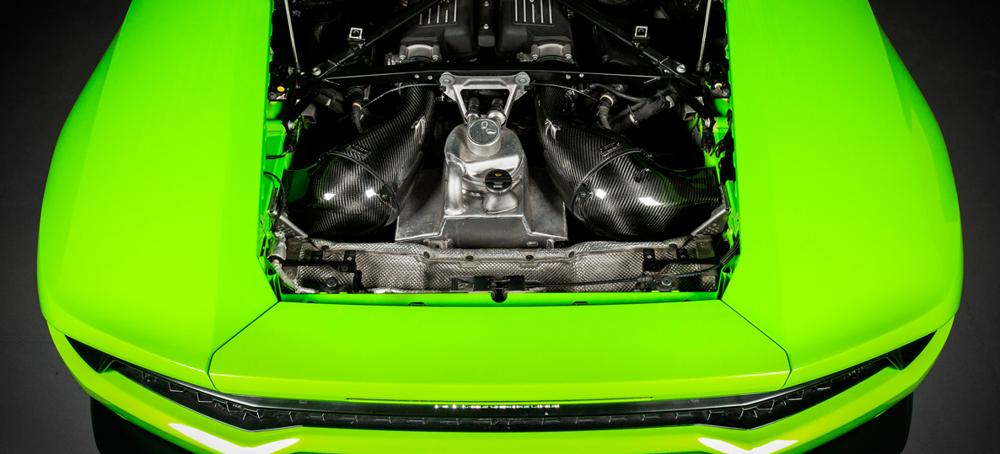 Below are independent dyno graphs showing the comparison between the Eventuri and the stock airboxes on a Huracan with a tune. The only thing changed between runs was the intake itself. All runs have the tune already applied. As you can see, power and torque are increased through a large portion of the rpm range not just at the peak. This translates on the road to increased part throttle and full throttle response with the car pulling much more eagerly to the redline. The testing was done on the same day back-to-back and temperatures were monitored to ensure consistency. Since dyno results vary between consecutive runs, this graph shows the highest power figure achieved with the stock setup vs the highest figure with the Eventuri.