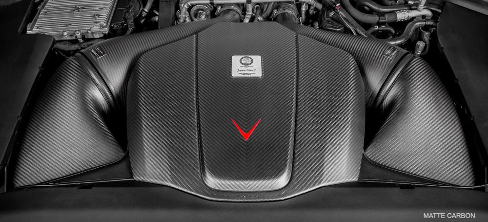 Carbon Center CoverThe internal volume of the filter housings have been maximised in order to de-restrict the flow path to the turbos. In doing so, the OEM center cover also needed to be modified to prevent it from fouling with the housings. We therefore designed a new cover which allows fitment of the larger filter housings and also provide a finished look to the engine bay. The new cover is made in carbon and features a V shape carbon weave pattern to provide symmetry to the intake as a whole. We have also included a recess in the cover to allow fitment of the engine build plaque from the OEM cover.