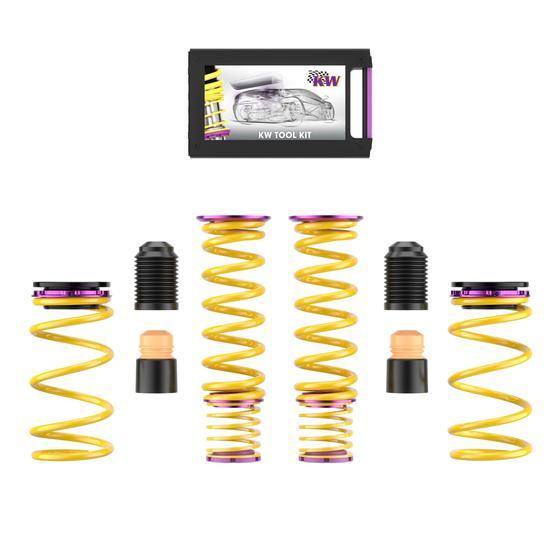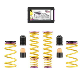 The KW height adjustable spring kit is used for lowering of the vehicle in combination with the standard dampers. Unlike to conventional spring kits, a customized height adjustment is possible within the tested adjustment range. For this solution, vehicle-specific spring seats with adapted KW lowering springs and matching elastomers as well as dust protection systems are used. The standard damper system for example with electronic or hydraulic control, continues to remain active.