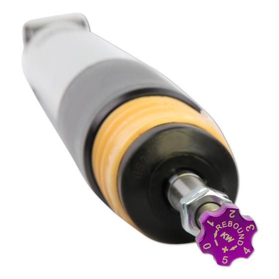 The rebound adjuster knob provides 16 precise clicks to personally dial in your desired vehicle setup. Thus allowing you the possibility to influence wheel/tire loads or take into concern chassis characteristics. Independent from rebound adjustment is the compression dampening, 12 precise adjustment clicks are provided to adjust the low-speed dampening. Most notably used to dial in wheel/tire setup.