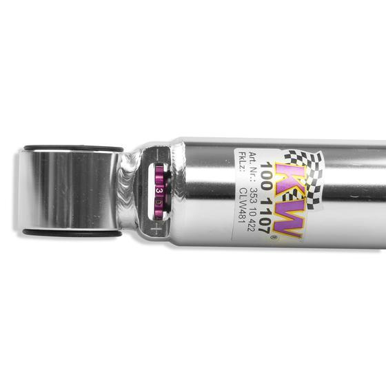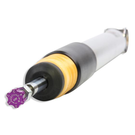 With the individually adjustable rebound setup of the KW V3 you can directly influence the handling and comfort with its precise click adjustment. Depending on the vehicle type, the rebound valves of the KW twin-tube dampers on the upper end of the piston rod will be adjusted via an integrated adjustment wheel or a twist-adjustment wheel which is included in the delivery content.