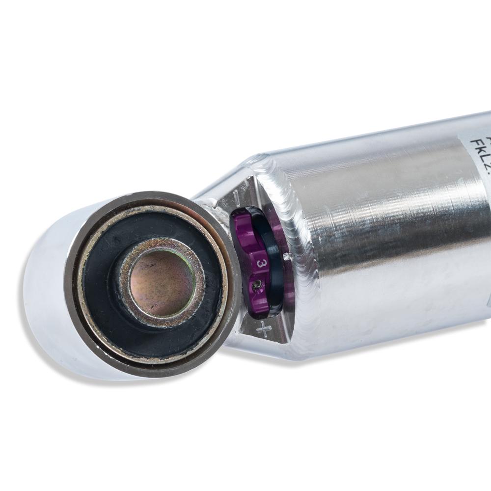 You don’t need any adjusting tools because of the patented compression adjuster at the lower end of the stainless steel housing. The adjustable compression damping with its twelve exact clicks allows you to manually influence body roll, without having to change the spring rate which optimally matches the rebound.