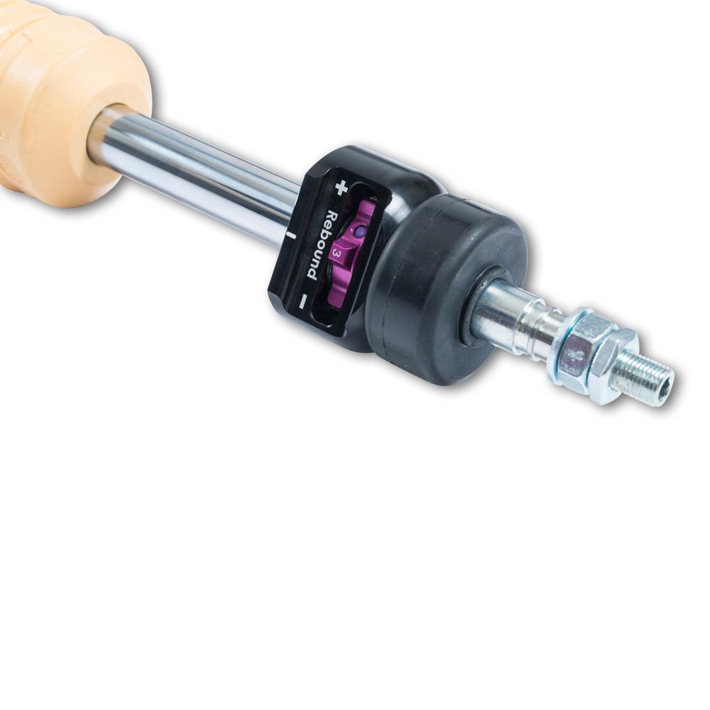 With the individually adjustable rebound setup of the KW V3 you can directly influence the handling and comfort with its precise click adjustment. Depending on the vehicle type, the rebound valves of the KW twin-tube dampers on the upper end of the piston rod will be adjusted via an integrated adjustment wheel or a twist-adjustment wheel which is included in the delivery content.