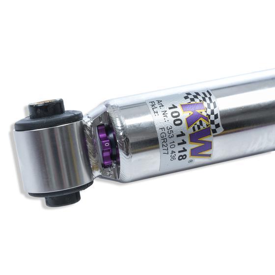 With the individually adjustable rebound setup of the KW V3 you can directly influence the handling and comfort with its precise click adjustment. Depending on the vehicle type, the rebound valves of the KW twin-tube dampers on the upper end of the piston rod will be adjusted via an integrated adjustment wheel or a twist-adjustment wheel which is included in the delivery content.