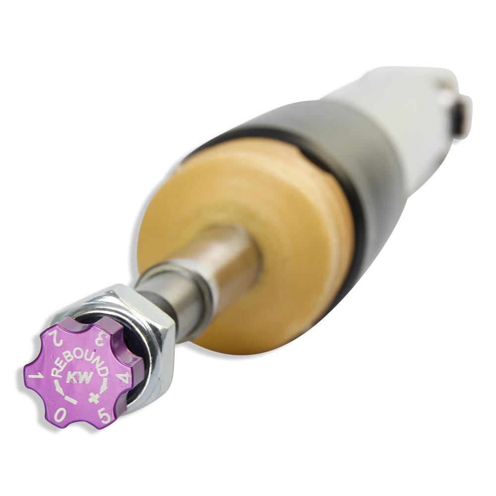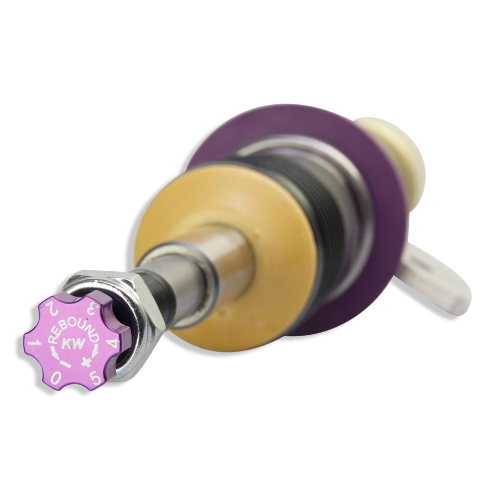 With the individually adjustable rebound setup of the KW V3 you can directly influence the handling and comfort with its precise click adjustment. Depending on the vehicle type, the rebound valves of the KW twin-tube dampers on the upper end of the piston rod will be adjusted via an integrated adjustment wheel or a twist-adjustment wheel which is included in the delivery content.