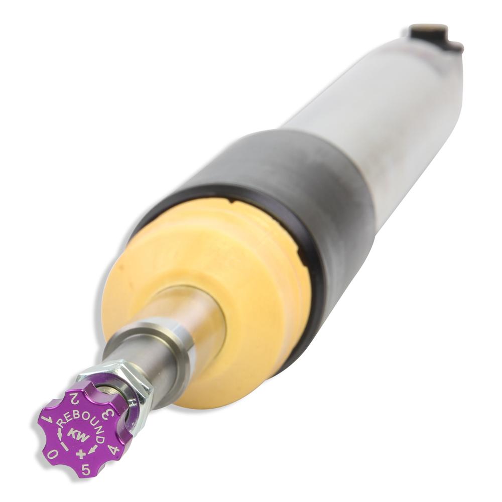 With the individually adjustable rebound setup of the KW V3 you can directly influence the handling and comfort with its precise click adjustment. Depending on the vehicle type, the rebound valves of the KW twin-tube dampers on the upper end of the piston rod will be adjusted via an integrated adjustment wheel or a twist-adjustment wheel which is included in the delivery content.