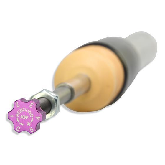 With the individually adjustable rebound setup of the KW V3 you can directly influence the handling and comfort with its precise click adjustment. Depending on the vehicle type, the rebound valves of the KW twin-tube dampers on the upper end of the piston rod will be adjusted via an integrated adjustment wheel or a twist-adjustment wheel which is included in the delivery content.