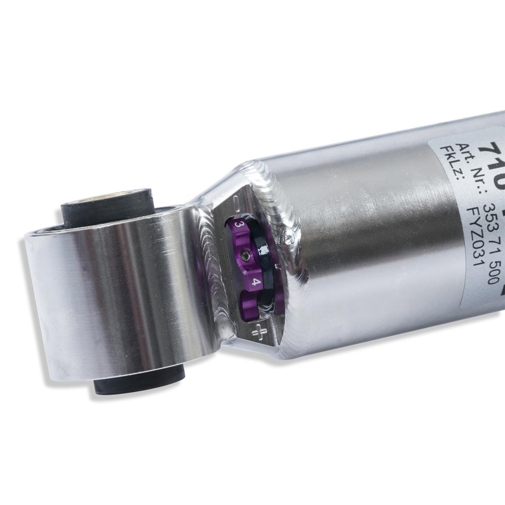 You don’t need any adjusting tools because of the patented compression adjuster at the lower end of the stainless steel housing. The adjustable compression damping with its twelve exact clicks allows you to manually influence body roll, without having to change the spring rate which optimally matches the rebound.