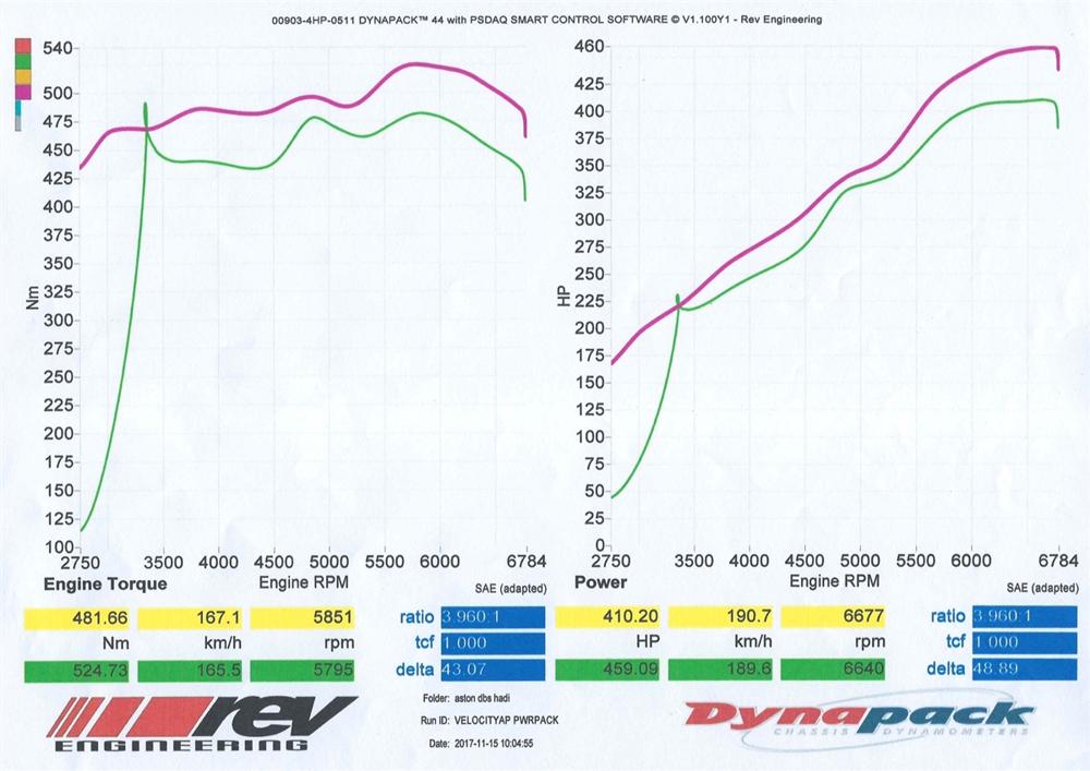 HP and torque have been improved across the RPM range, leading our test driver (who has plenty of single seater race time under his belt) to say “Definitely need the Traction Control ON!” This DB9, with nearly as much HP as a DBS and an additional 64.75ft/lbs of torque, is now much quicker than a DBS under real world driving conditions.