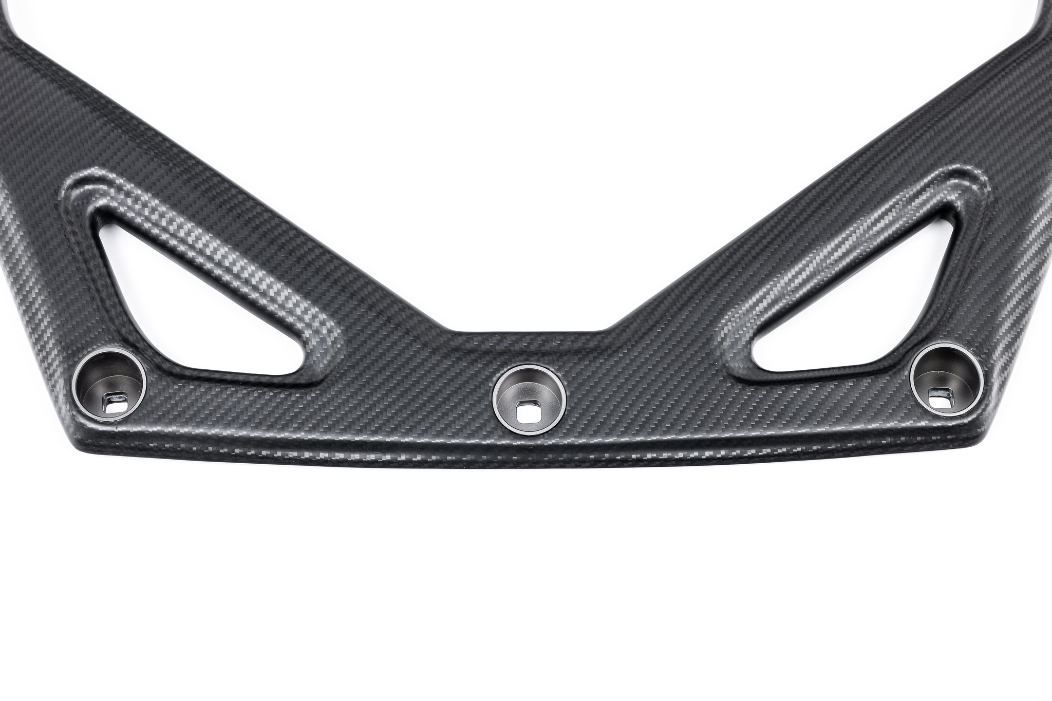 The complex surface design showcases raised sections and deep fillets, which are harmoniously complemented by fluid lines that bring everything together in an organic fashion. The mounting positions are crafted with deeply sculpted pockets that are lined with satin anodized inserts, creating a beautiful contrast against the carbon fiber finish.