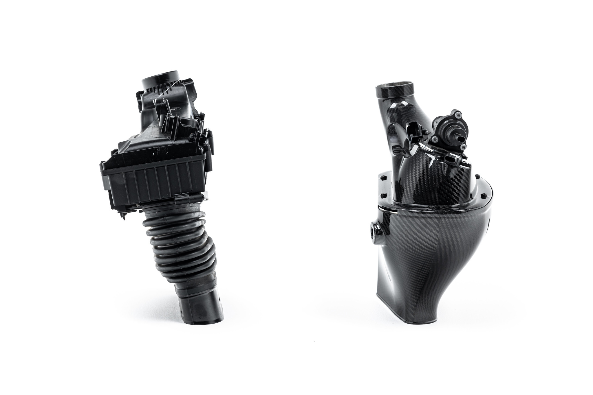 We conducted flow rate tests using a Superflow SF-1020 to measure the maximum flow rate possible at a pressure drop of 28” H2O. Tests were done on the same day in controlled conditions using the same test jig for each system. We tested our full intake system against the stock airbox system. The results show just how restrictive the stock airbox is, which we have managed to improve by up to 25% in maximum possible flow rate. Importantly this has been achieved with a sealed intake system taking the air feed from the same location as the OEM system. An open system would flow more but at the expense of intake air temperatures, which would be detrimental to performance.