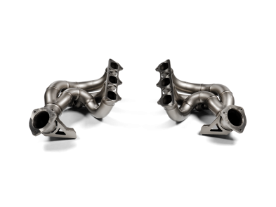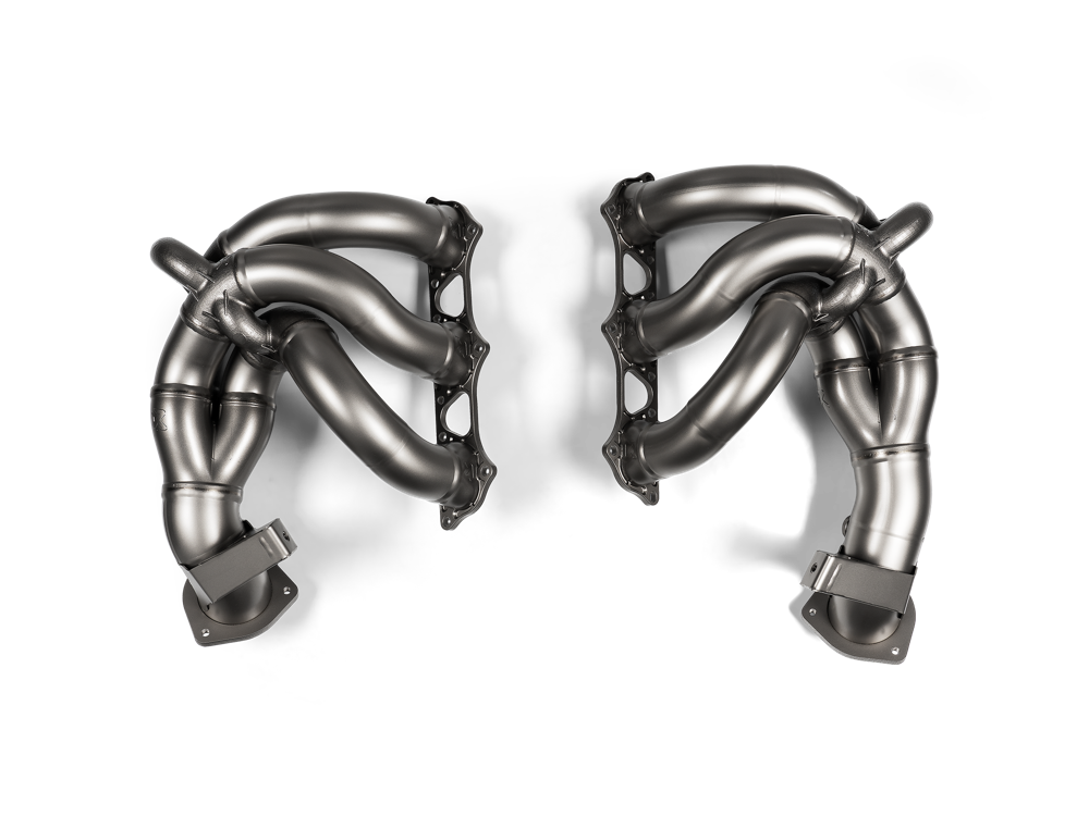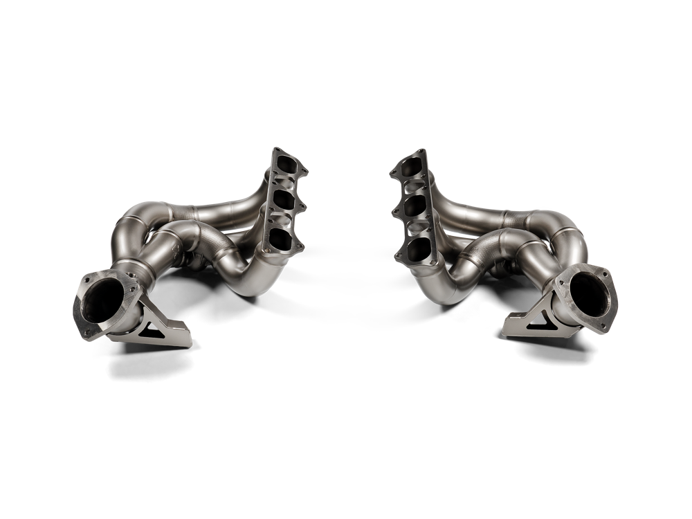 Using race-proven solutions, this high-grade titanium header set features a special manifold runner crossover part on each side. This technological innovation is a masterpiece of engineering and enhances the performance of the complete exhaust in the mid range. Several parts are cast in the in-house foundry, including the three-in-one collectors designed for smooth gas flow. The weight is 5 kg (51.9%) less than the standard system and, when installed with the Slip-On Race Line (Titanium) and Link Pipe Set (Titanium), power and torque increase by 26 kW (35.4 hp) at 4,900 rpm and by 50.9 Nm at 4,900 rpm when tested on the Akrapovic dyno against a Porsche 718 Cayman GT4 RS with a standard stock system. It provides a true racing sound, full of character with a distinct note during gear shifts. With the installation, remapping is mandatory, and this track-oriented part and full system have been developed for use on closed-course competition circuits only.