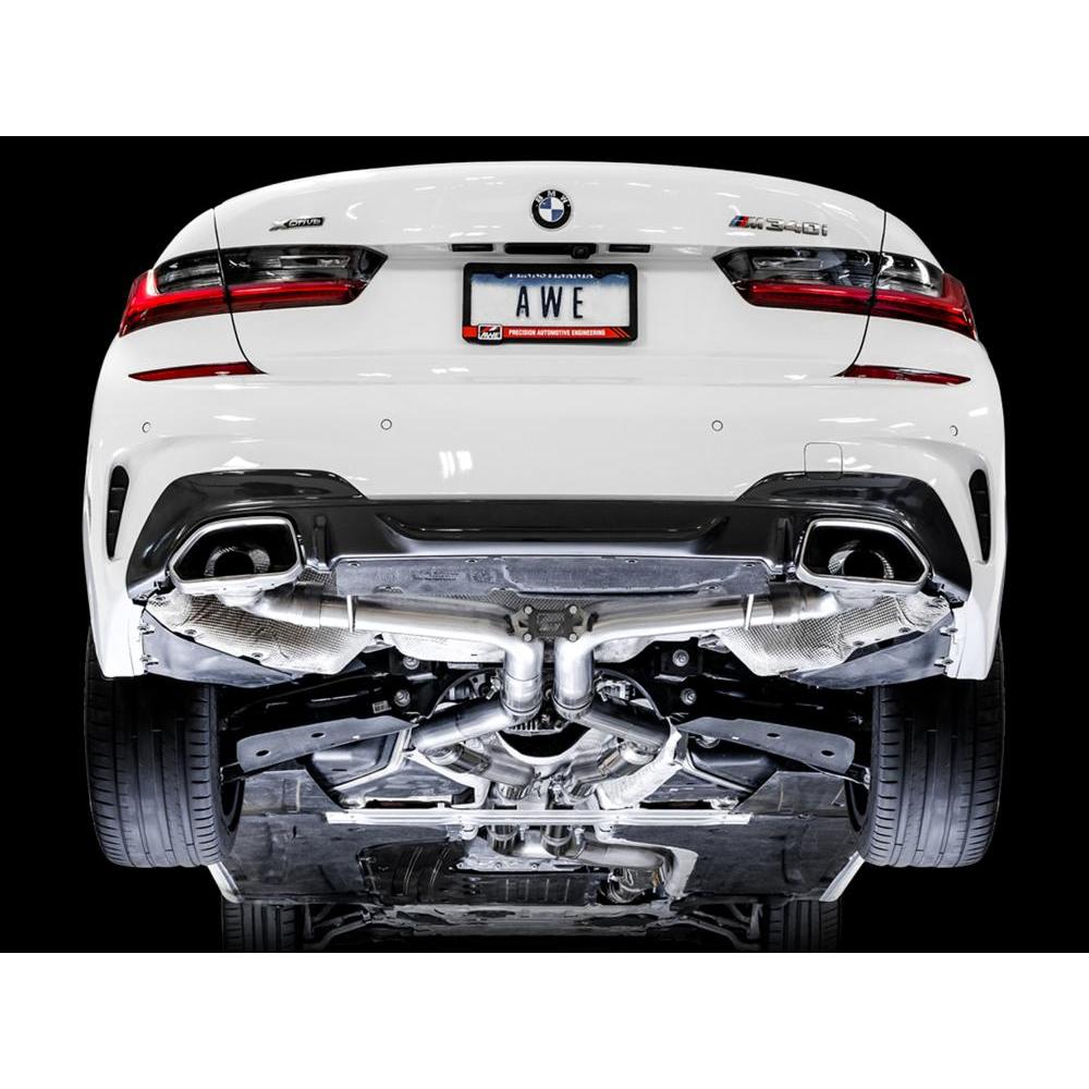 For those who like it raw, rowdy, and light (drivers can expect an 11 lb weight savings compared to stock), the AWE Track Edition is for you. The Track Edition comes equipped with bullet resonators in the mid-pipes, and shares the same bespoke stainless steel stamped merge and precision engineering as its Touring Edition counterpart, minus AWE’s patented drone-canceling solution, 180 Technology®. In place of the 180 Technology® resonators in the rear are dual Track Edition straight sections. As a result, this version is known to get (really) rowdy in mid-range acceleration and deceleration and may be too much for many. Due to this reason, AWE Track Edition Exhausts cannot be returned based on sound preference. You've been warned! However, AWE made it easy to convert between Track and Touring Editions if you decide at a later date to change your volume.This version of the exhaust keeps your OE tips in place, for that OEM look - super stealth. Presenting the AWE Track Edition Exhaust for the BMW G2X M340i and M440i.