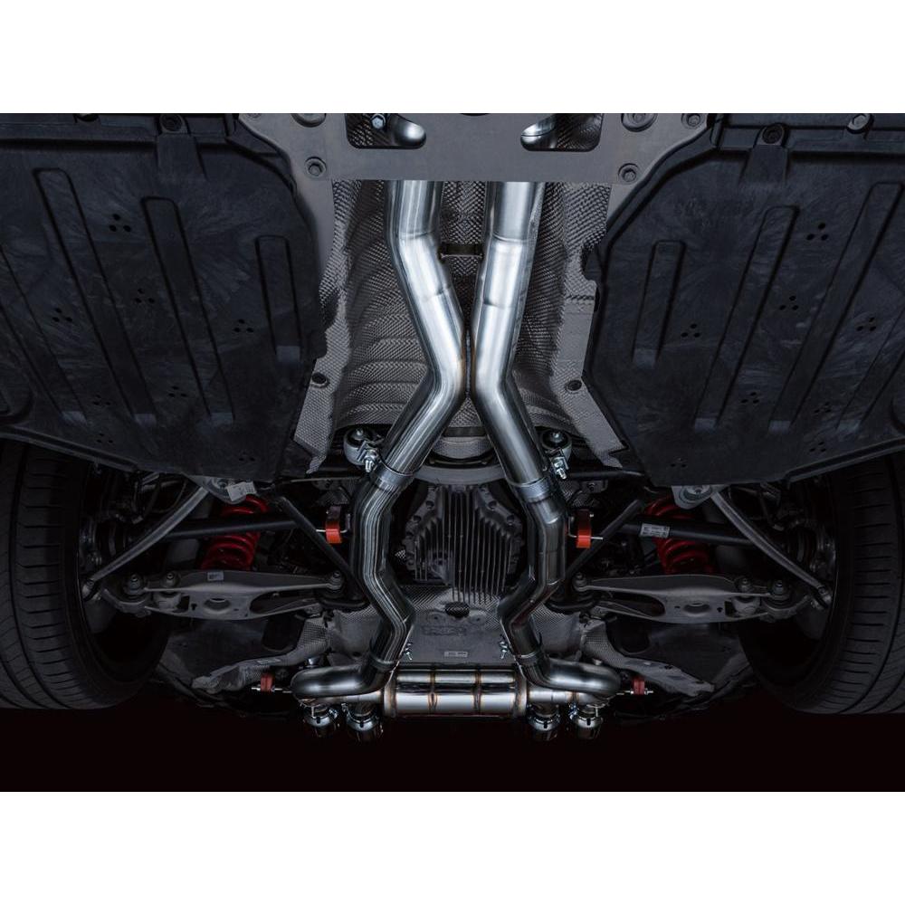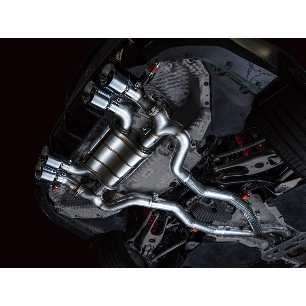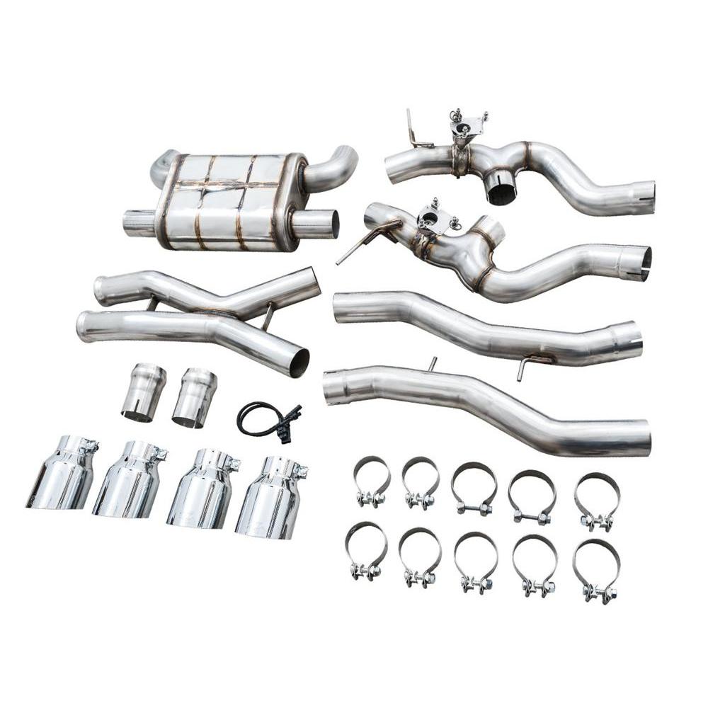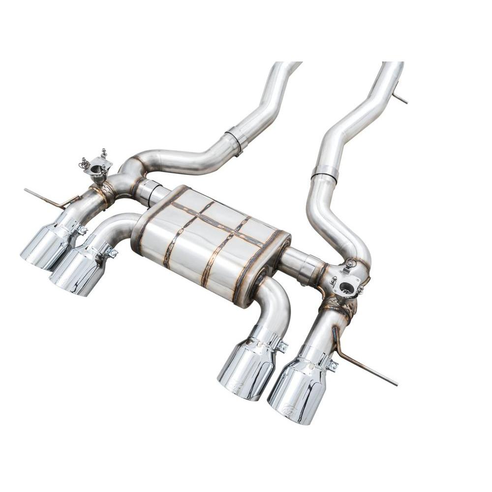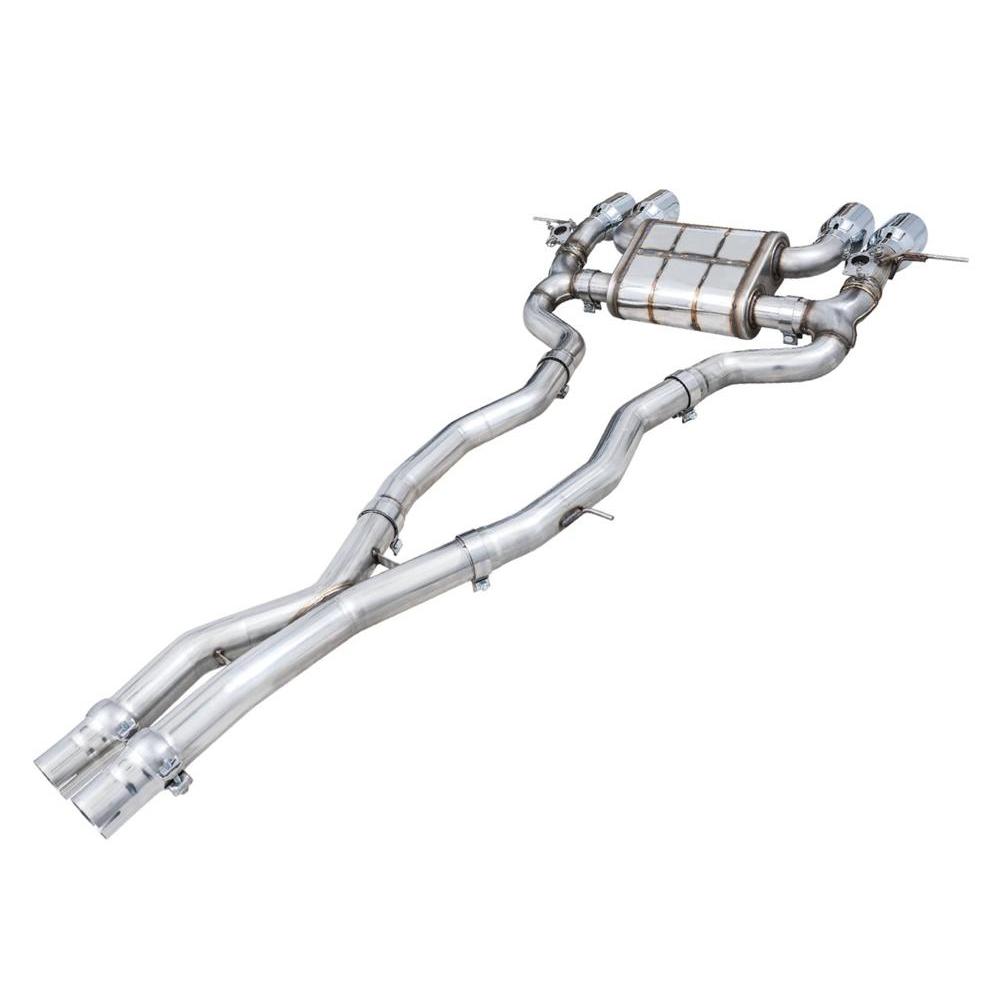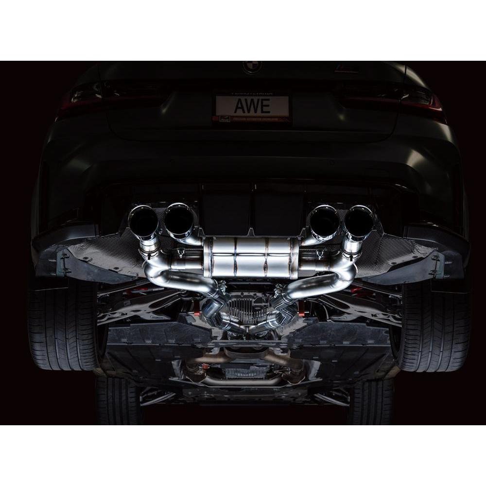 Presenting the first AWE SwitchPath™ configuration for BMW to incorporate patented drone-canceling 180 Technology®. No drone, minimal bends, maximum flow, and push-button attitude. The SwitchPath™ Exhaust is comprised of 3-inch U.S.-sourced T304L stainless steel, a precision x-pipe, and a valved SwitchPath™ muffler tuned specifically for the S58. Beginning after factory mid pipe, the precision X-pipe immediately helps smooth the S58 of its rasp, deepening the tone before its refined further by the bespoke SwitchPath™ muffler in the rear. When the valves are closed, the SwitchPath™ Exhaust produces a refined, aggressive howl while remaining full-bodied and powerful – no congested, metallic sounds when on the throttle. At cruising speeds, interior acoustics are close to stock with no drone at cruising speeds. AWE SwitchPath™ tech also responds perfectly to the many transmission settings and shift points in automatic vehicles. Drop the hammer with the valves closed and SwitchPath™ sings a proper M anthem. If you were to leave the valves closed at all times after equipping SwitchPath™, we wouldn’t blame you — it’s that good… all of the time. Open the valves and the S58’s roar is uncorked. Sport and Sport+ modes achieve the ultimate contrast in behavior when compared to comfort driving modes (valves closed). In Sport mode, the exhaust note is powerful, clean, and aggressive. In Sport+ mode, the same aggression applies… but with grin-provoking burbles. Thanks to the precision X-pipe, the rasp is still kept in check while allowing the exhaust note to reach full aggression.