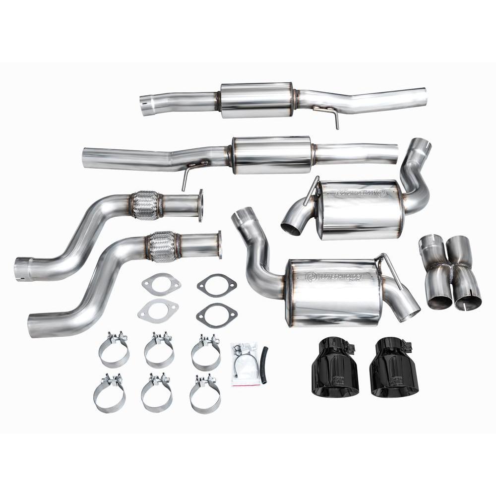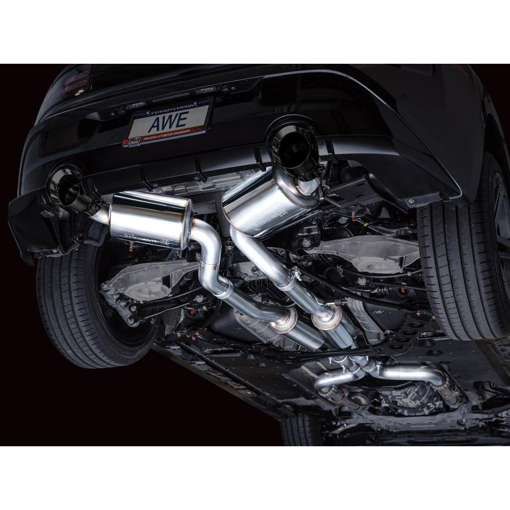 At the intersection of sophistication and aggression lies the Touring Edition Exhaust. Full 3" dual catback build for big boost, equipped with a symmetric X-pipe and robust resonators ready for big boost. The Touring Edition features AWE’s patented drone-canceling 180 Technology®. The sole mission of 180 Technology® resonators is to destroy drone-prone frequencies to keep you comfortable in the cabin at cruising speeds while producing full bodied tones outside of the cabin. Each 180 Technology® resonator features a straight-through design (i.e. if you were to look inside it would resemble the inside of a straight length of steel tubing) for optimum performance, and in conjunction with the dual 3” design, X-pipe, and robust resonators, this configuration perfect for drivers looking to get spicy upstream with lower downpipes and beyond. Comes complete with two 5" diamond black slash-cut tips, and all necessary hardware for installation. Each exhaust comes complete with bespoke adapter plates and gaskets to AWE’s dual 3” system to factory downpipes. If you’re mating to aftermarket components, this hardware is not needed.