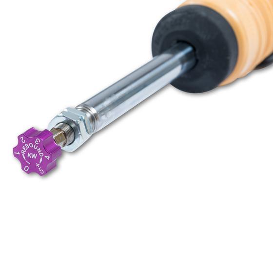 Depending on vehicle type, the rebound valves of the KW twin-tube dampers have to be adjusted at the upper end of the piston rod with an integrated adjustment wheel or the twist-adjuster which is part of the delivery content. By increasing the rebound force via the adjustment wheel, the body movements are reduced. Your car will stay in line and you will have more stability at increased corner speed. If you change for example the wheel / tire combination (approved by the car manufacturer) to larger wheels, then with a KW V2 you will be able to adjust the car's handling and the new wheels perfectly to each other.