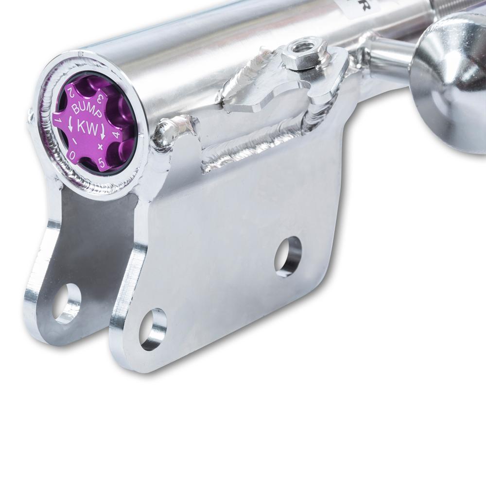 The rebound adjuster knob provides 16 precise clicks to personally dial in your desired vehicle setup. Thus allowing you the possibility to influence wheel/tire loads or take into concern chassis characteristics. Independent from rebound adjustment is the compression dampening, 12 precise adjustment clicks are provided to adjust the low-speed dampening. Most notably used to dial in wheel/tire setup.