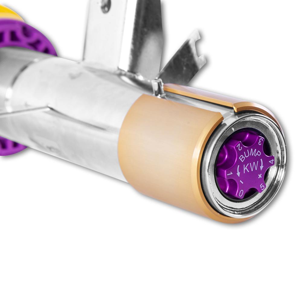 Similar to our racing coilovers from the KW Racing program, the KW V3 can be adjusted independently in compression and rebound damping. This individual adjustment possibility is much appreciated by sports car manufacturers, tuners and drivers worldwide.